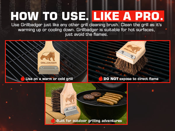 Grillbadger is the all natural grill cleaning brush. It features tough, durable, all natural bristles with an angled wooden handle, and a sturdy steel scraper. Great for backyard grills and bbq smokers too.